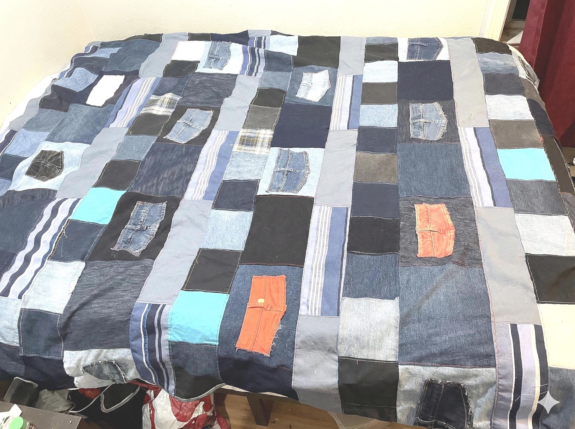 The patchwork top features an eye-catching array of blues, greys, turquoise, and white, with pops of red-orange from repurposed pockets, all meticulously pieced together with a decorative zig-zag stitch. The varied textures and colors create a visually rich and inviting bedspread that is sure to be a conversation starter.