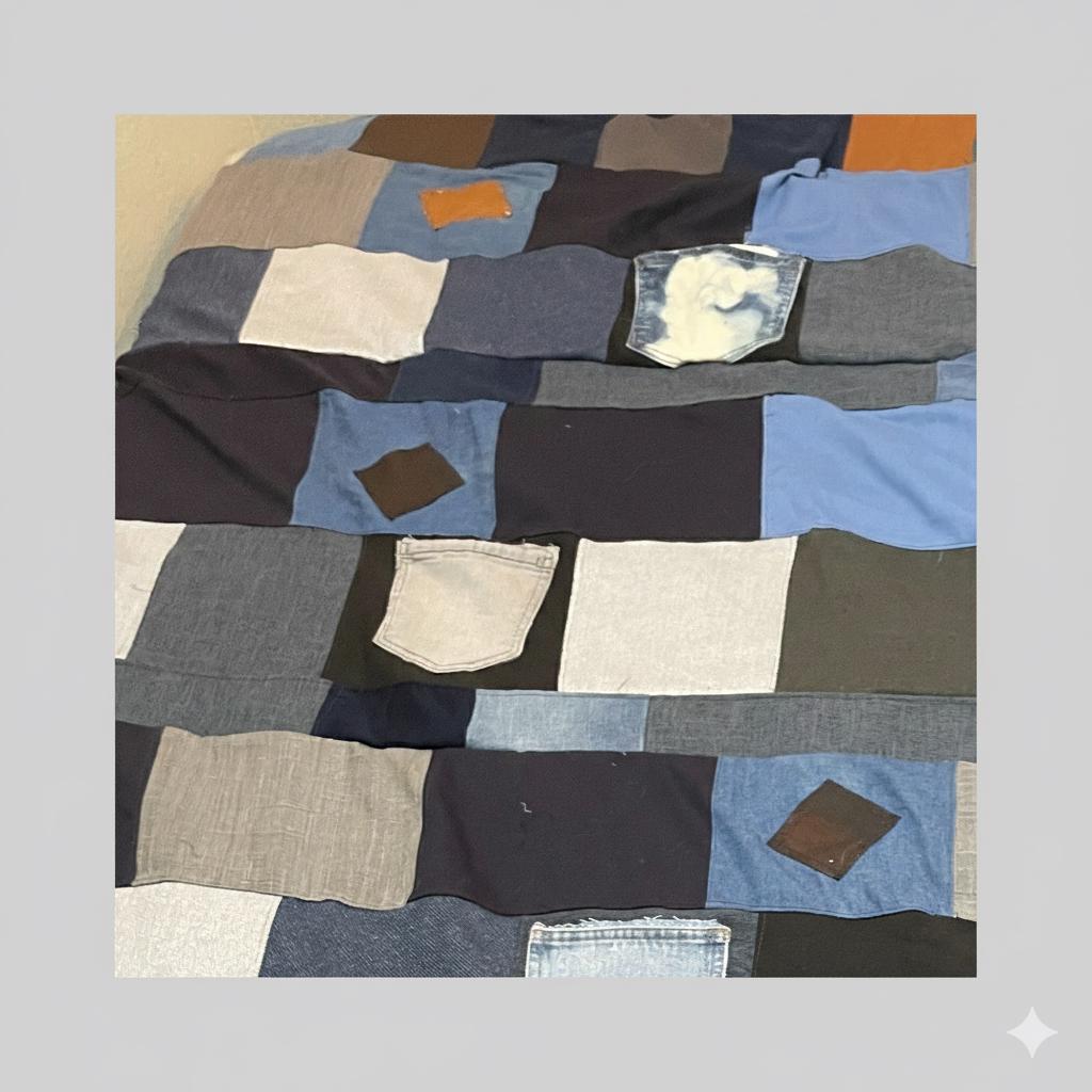 Meticulously handcrafted from reclaimed denim and high-quality textiles, this piece is the perfect blend of cozy comfort and industrial chic. Every square tells a story, featuring a variety of washes ranging from deep indigo to soft stonewash, interspersed with unique textures and earth-toned accents.